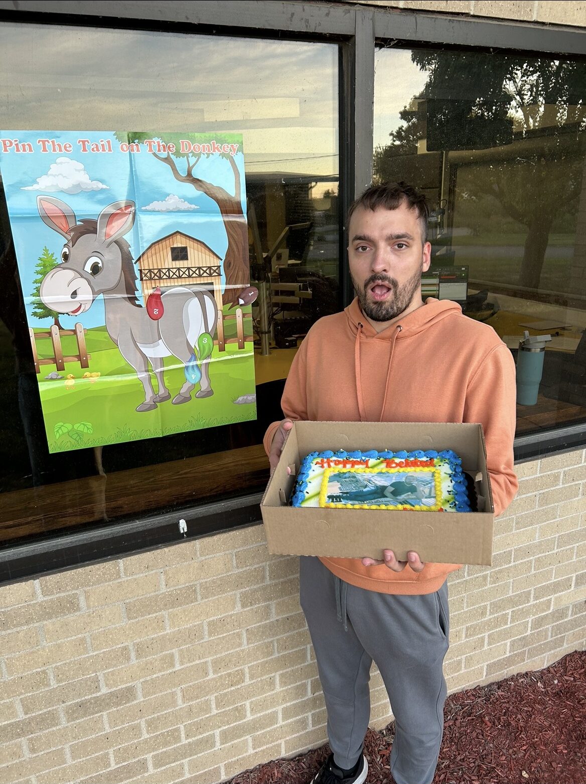 Producer Ben was SO surprised! We brought out a cake and–for the first time ever–he got to play Pin the Tail on the Donkey.