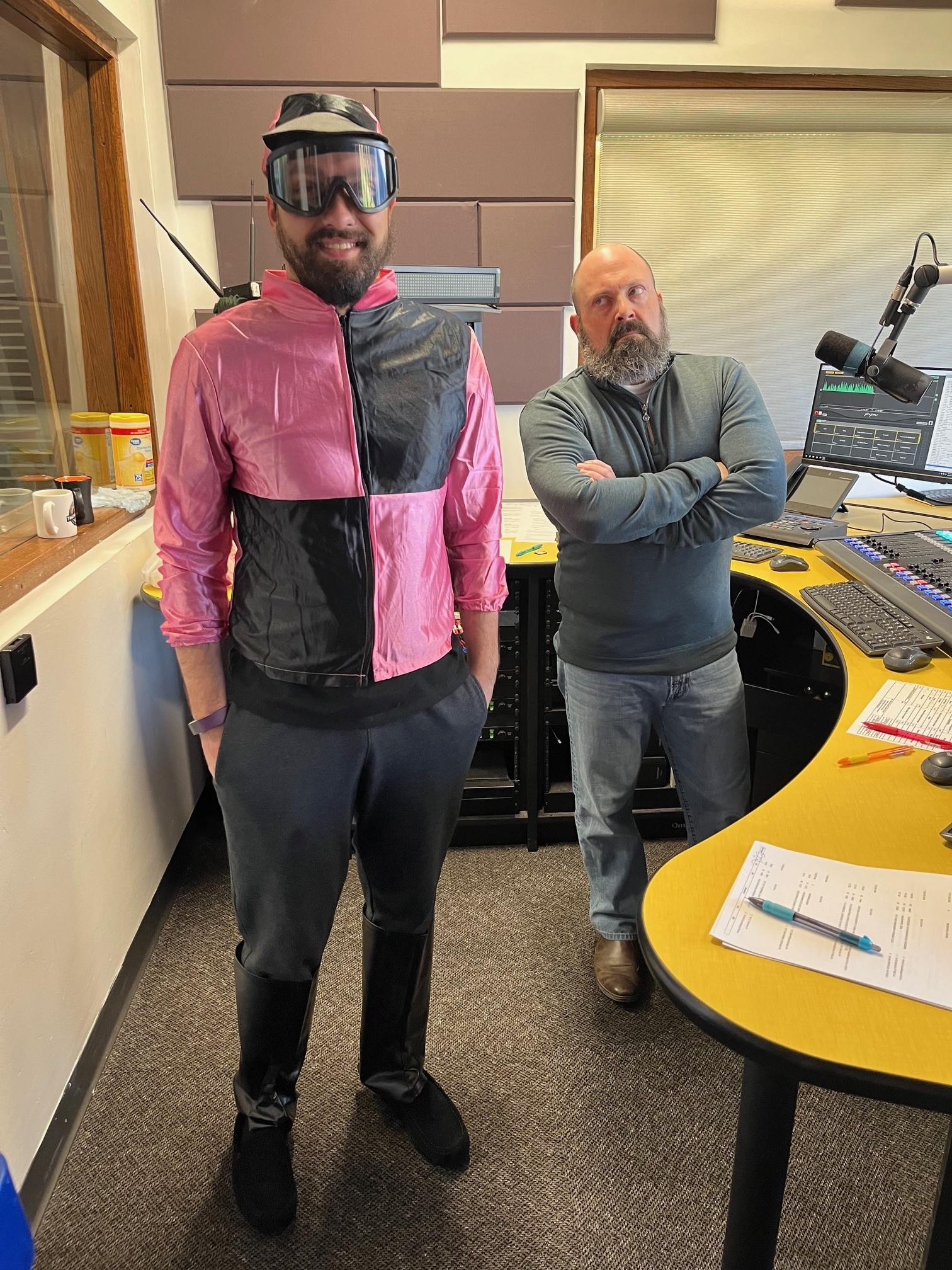 Producer Ben tried on his jockey costume, but refused to show off his white pants. They are a little see-through. But the top, hat, and goggles look great!