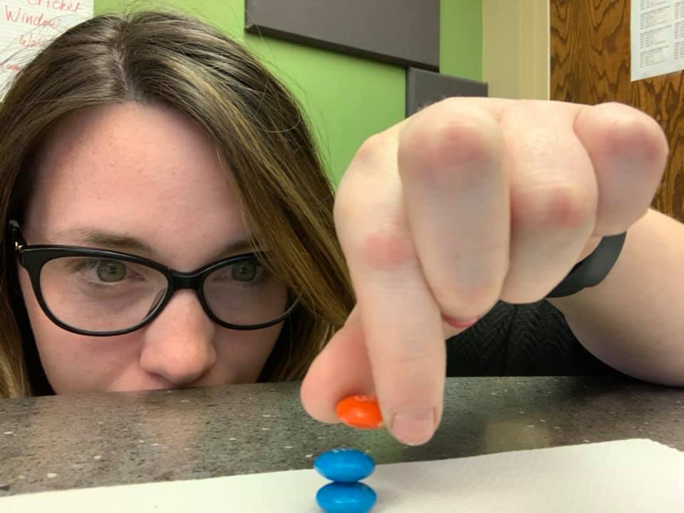 Destiny was determined to make a stack of at least 3 M&M’s. She was ultimately unsuccessful.