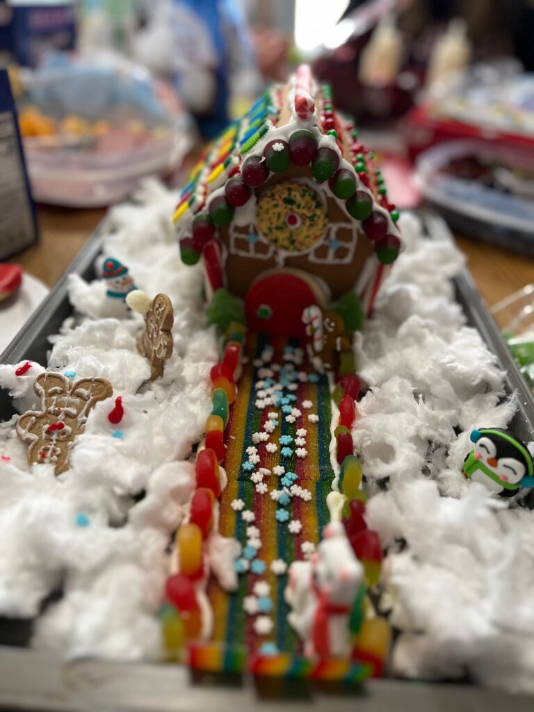 Clare participated in a family tradition: Gingerbread Smackdown 2024. She decorated alongside her daughter Cora who created a gruesome snowball fight in the front yard complete with frosting blood. So proud.