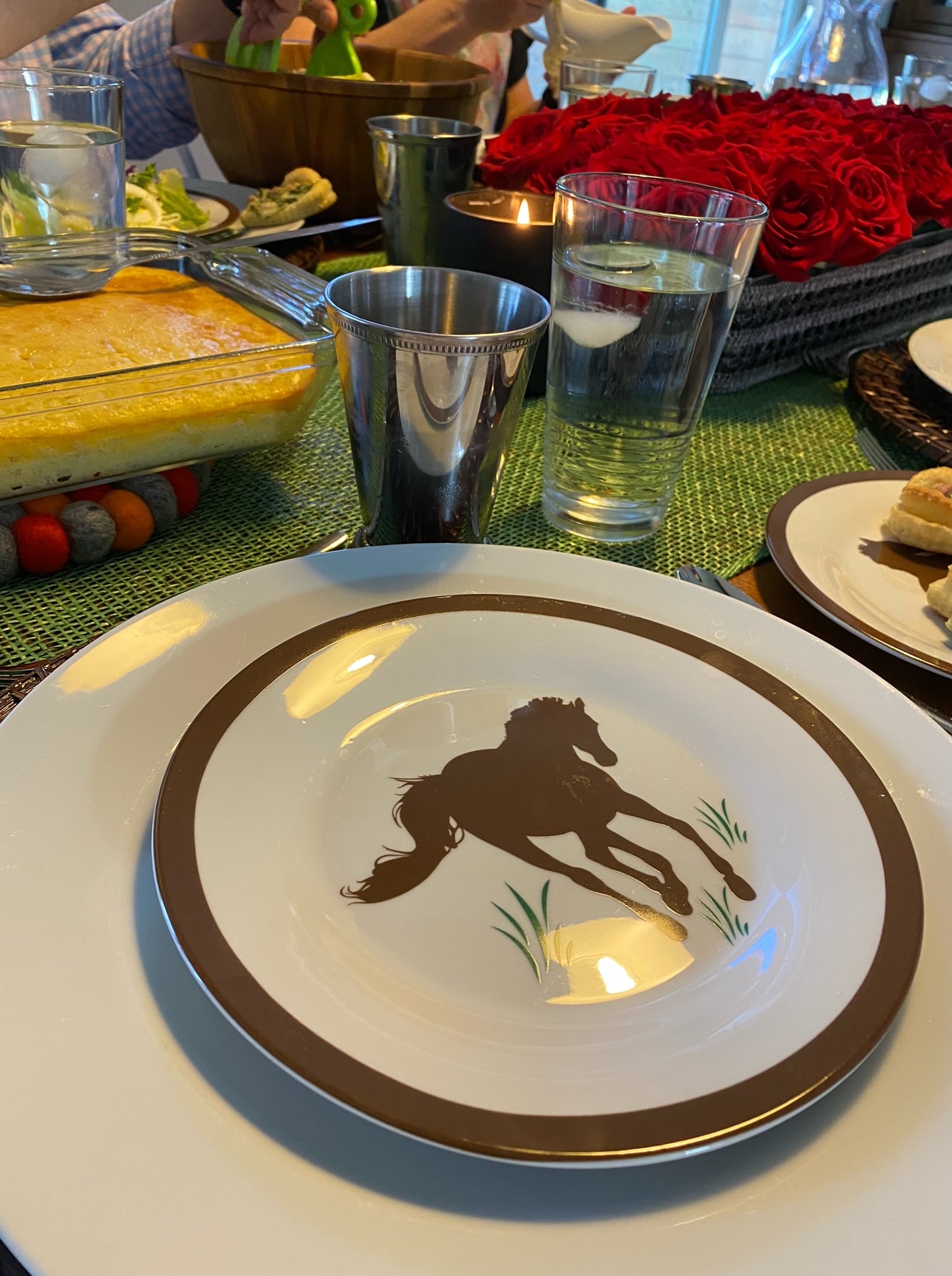 Eric’s Old Kentucky Home dinner included mint juleps, brisket, Hot Browns, cornbread, and salted butter cake, complete with julep tumblers, thoroughbred plates and a blanket and of roses centerpiece!
