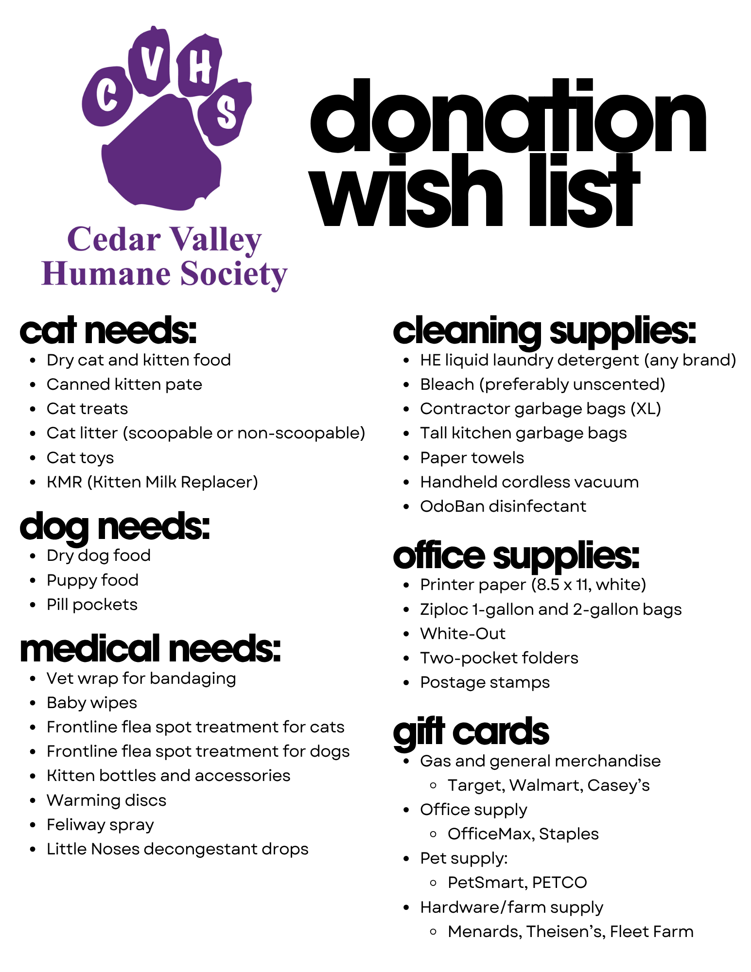 We want to support the whole family — pets and the people who love them! Bring pet supplies (food, treats, toys, office or cleaning supplies) to help the furry friends at Cedar Valley Humane Society, and non-perishable food items for HACAP to help families facing food insecurity right now in our community. Check out the wish lists for both organizations below!