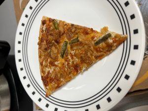 It tastes just like green bean casserole–the sauce is cream of mushroom soup, there’s a few green beans, and it’s topped with cheese and crispy onions. Eric didn’t like it because he doesn’t like green bean casserole. Destiny liked the flavor, but eating it in pizza form weirded her out. Clare says it’s good! Really good!