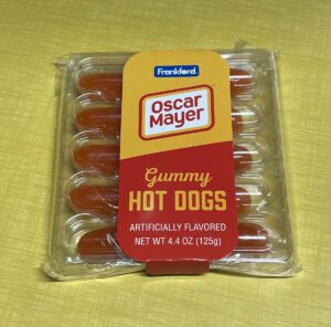 Gummy Hot Dogs are more of the same, vaguely fruity finish, chewy gummy. Yuck!