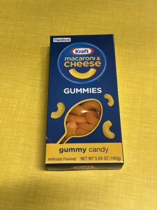Good work done by the packaging department–it really looks like a box of Kraft mac and cheese! But the gummy noodles are enormous and not tasty.