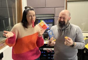 Gummy Lunchables are generous–Eric had turkey and cheese while Clare sampled the pepperoni and cheddar gummies. Fortunately, they were not savory. Although the light fruity flavor also gave a “new shoe” flavor.