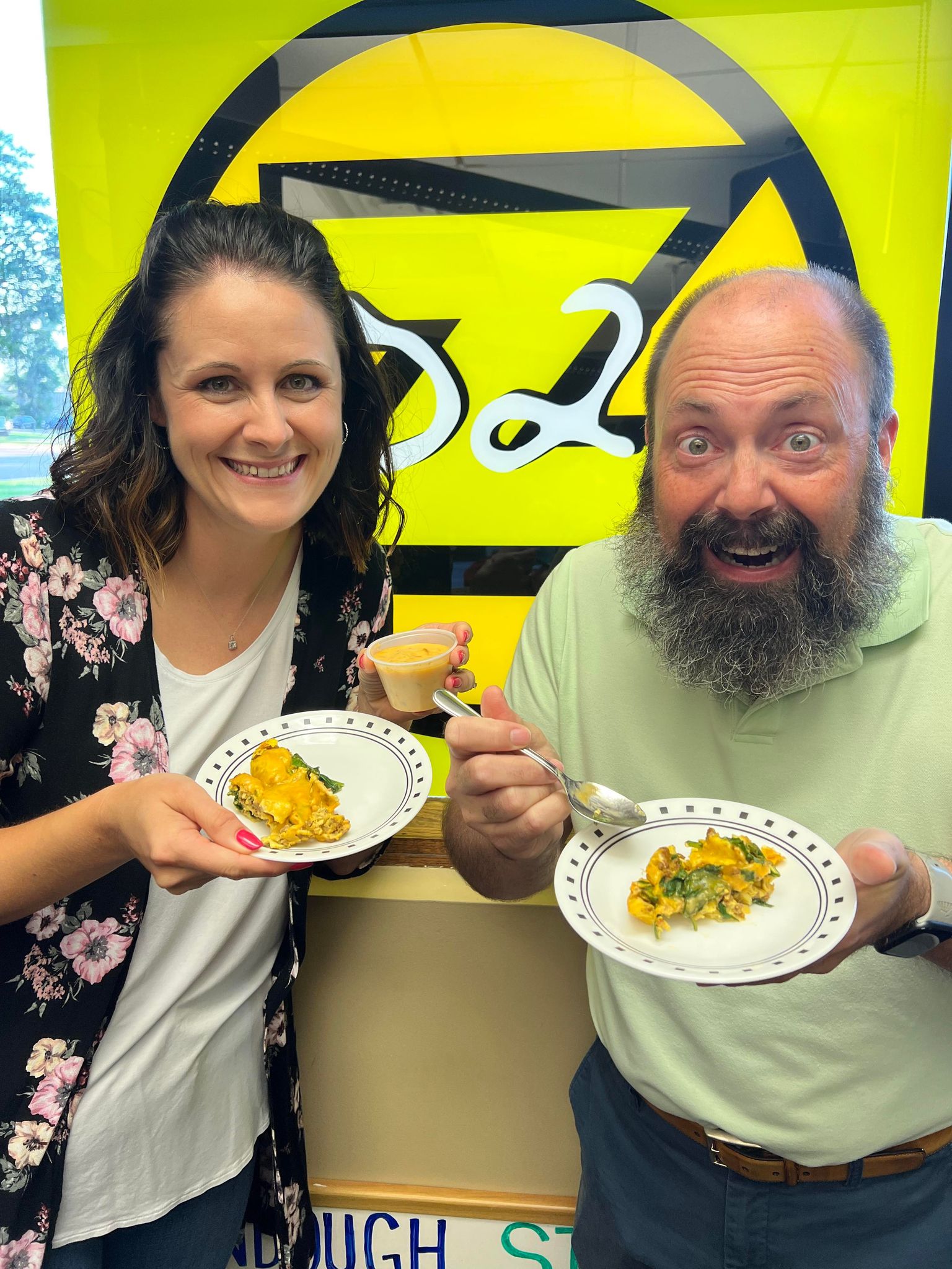 We’re pretty sure this is the dish! “The Morning Scrambler” featuring scrambled eggs filled with chorizo, spinach, cheddar jack, and green chili queso. Peppy and cheesy–just like us!