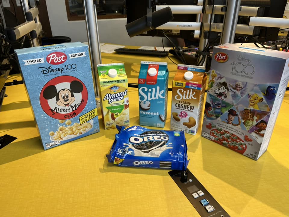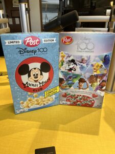Surprise! Milk loves cereal, so Clare got Eric some special Mikey Mouse cereals.