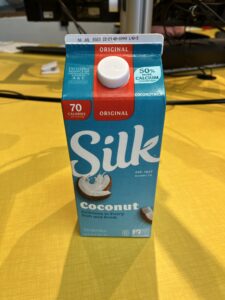 Coconut milk is white with a light coconut flavor. Clare and Eric thought it would best be enjoyed on a tropical vacation.