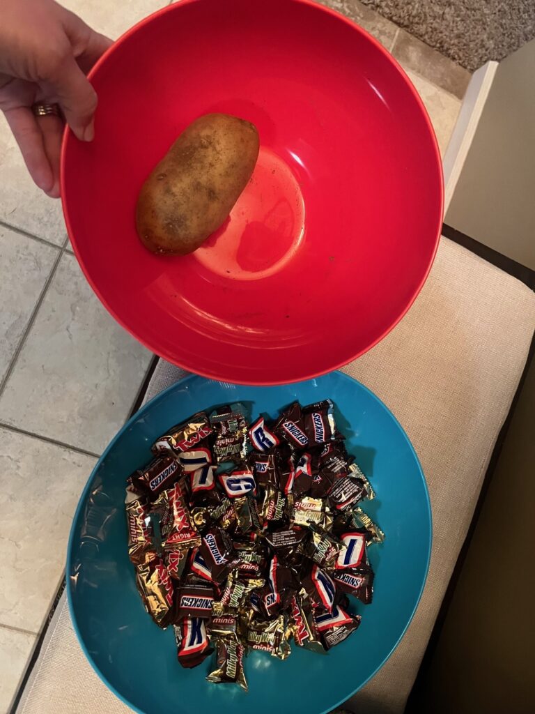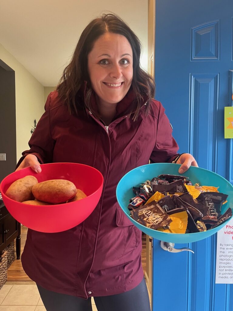 Tater or treat? Clare was ready with a bowl of potatoes and a bowl of candy and let the trick-or-treaters choose their treat.