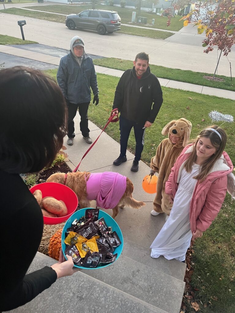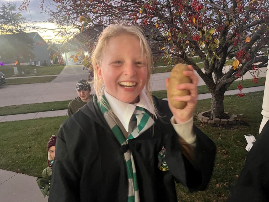 Clare was quickly down to just one potato just a half an hour into handing out Halloween candy.