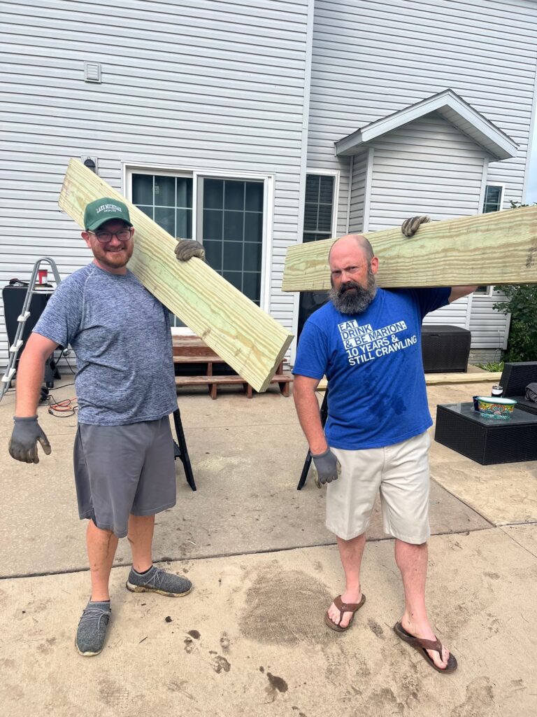They had to haul the boards through Clare’s backyard–which was not easy because Clare accidentally left the hose on the overwatered the yard. Whoops!